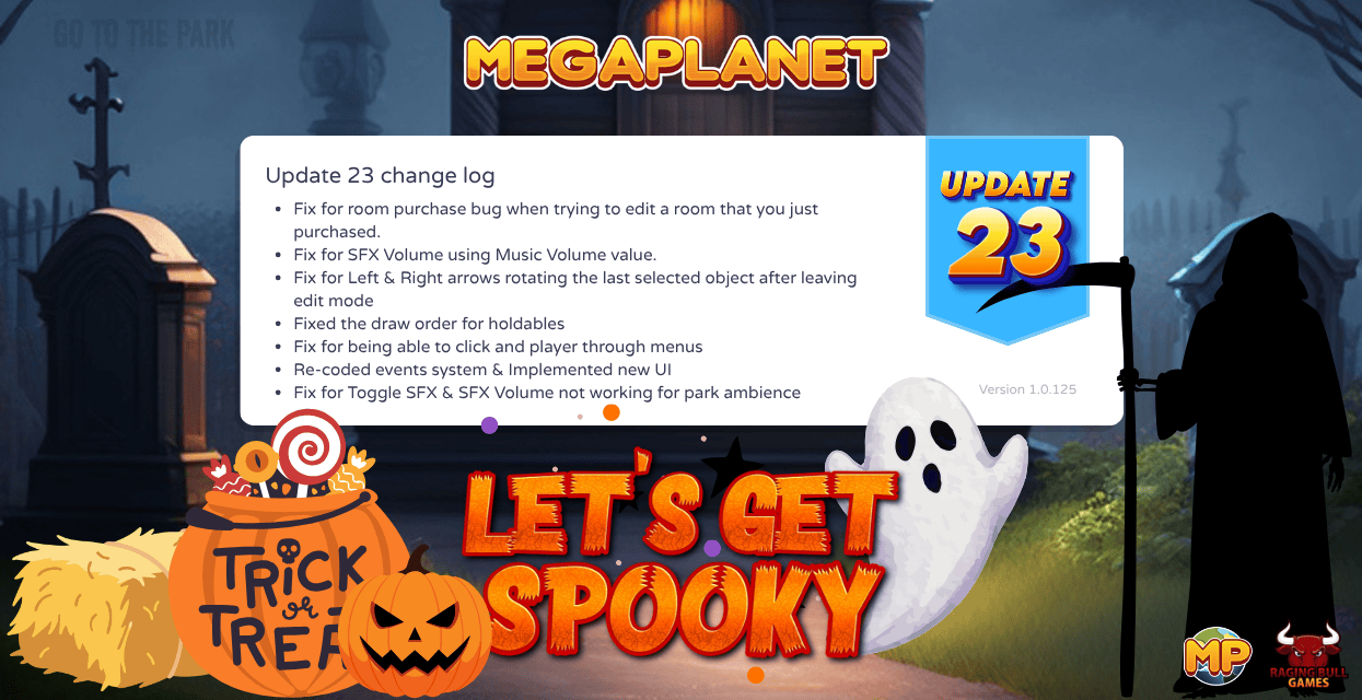 Tom-L Update 23 is LIVE! Fix for room purchase bug when trying to edit a room that you just purchased. Fix for SFX Volume using Music Volume value. Fix for Left & Right arrows rotating the last selected object after leaving edit mode Fixed the draw order for holdables Fix for being able to click and player through menus Re-coded events system & Implemented new UI Fix for Toggle SFX & SFX Volume not working for park ambience