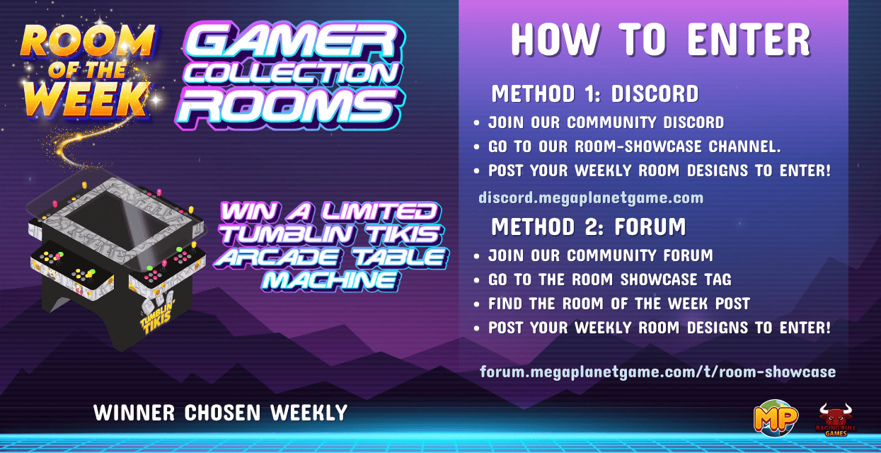Tom-L ROOM OF THE WEEK BEGINS NOW! Enter via the #🏠room-showcase channel or via the forum - https://forum.megaplanetgame.com/d/368-room-of-the-week-ending-23-nov-2025 This weeks theme: Gamer Collection This weeks Prize: Tumblin Tikis Arcade Machine worth 40 Gold! Ends: Sunday 23rd November 2025
